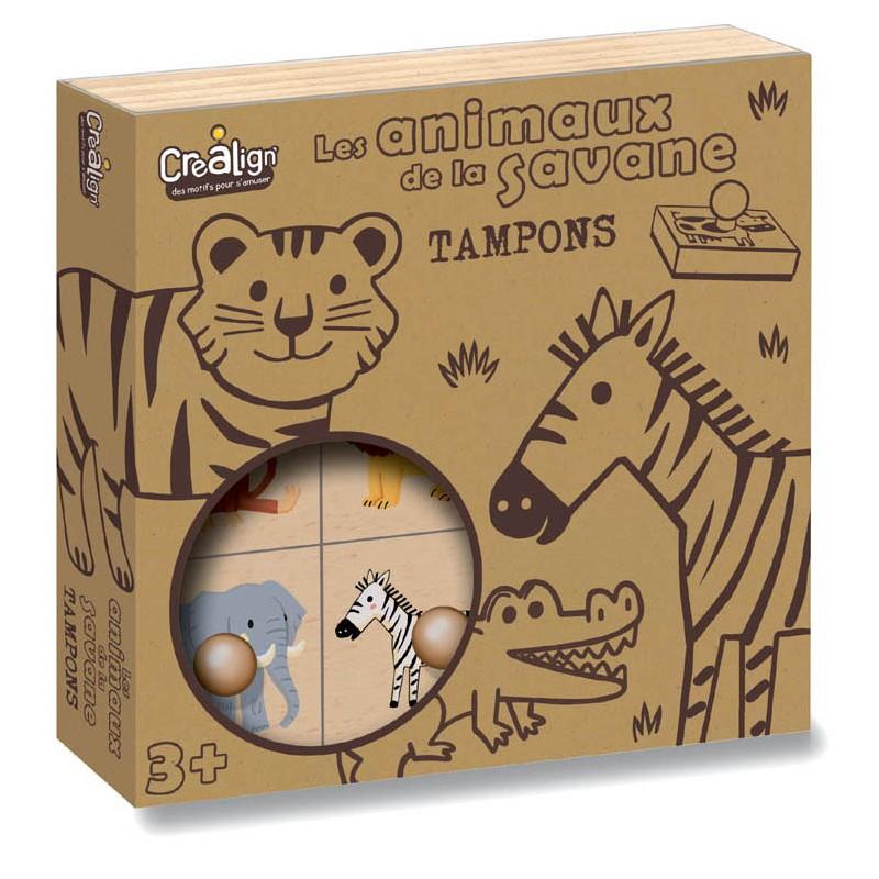 Puidust karbis savanni teemalised loomad tembeldamiseks. Siiditrükitud padjakestel on käepide, mis teeb neist haaramise mugavaks. Lapsed saavad luua oma safari ja lasta loovusel välja tulla.