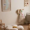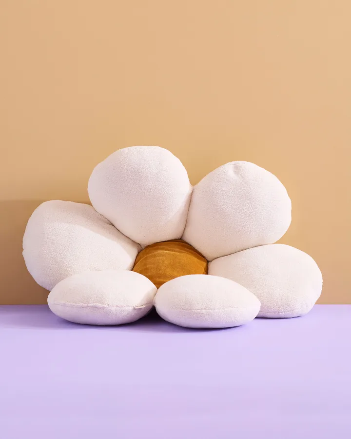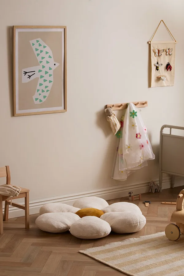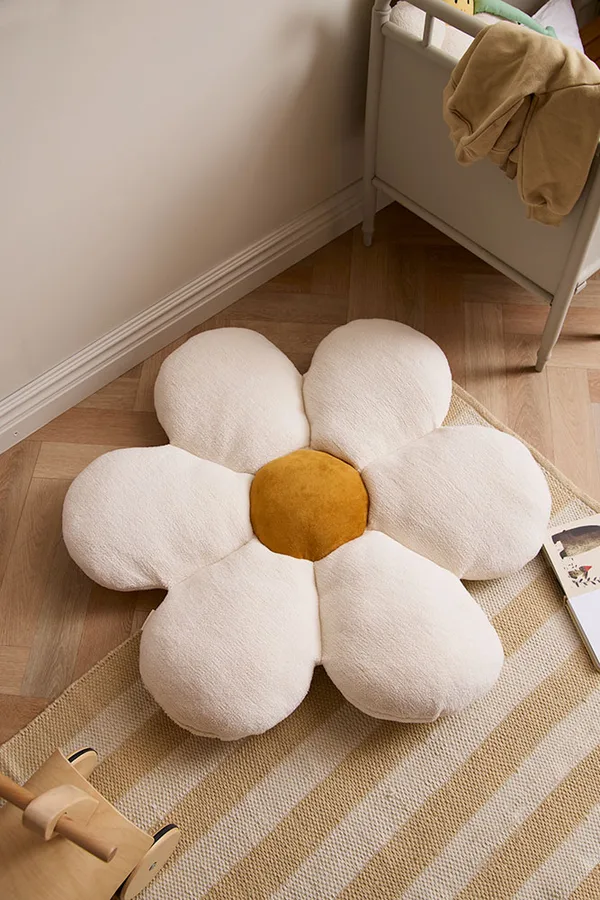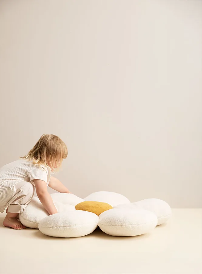 See suur lillekujuline põrandapadi muudab iga koha hubaseks puhkepaigaks. Pehmete ümarate kroonlehtede ja sametise keskosaga on see loodud vaikseks ajaveetmiseks, lugemiseks või lõõgastavaks mängimiseks. Kroonlehed on valmistatud pehmest šerpakangast – struktureeritud puuvillasegust, millel on soe, villataoline tekstuur, mis kutsub puudutama. Keskosa on valmistatud siledast puuvillasametist, et lisada kontrasti ja mugavust. Taaskasutatud polüestriga täidetud ja OEKO-TEX sertifitseeritud materjalidest valmistatud põrandapadi ühendab õrnad tekstuurid lihtsa funktsionaalsusega.
