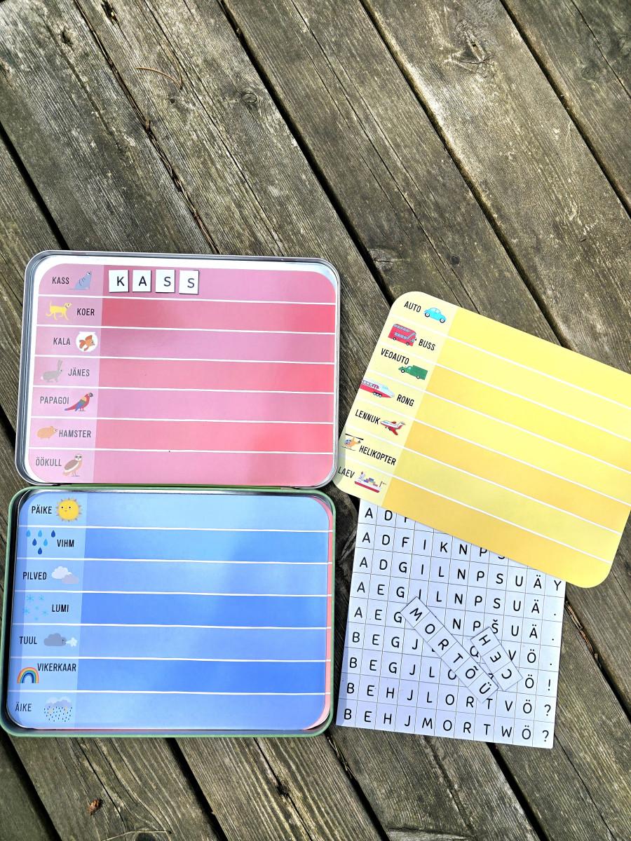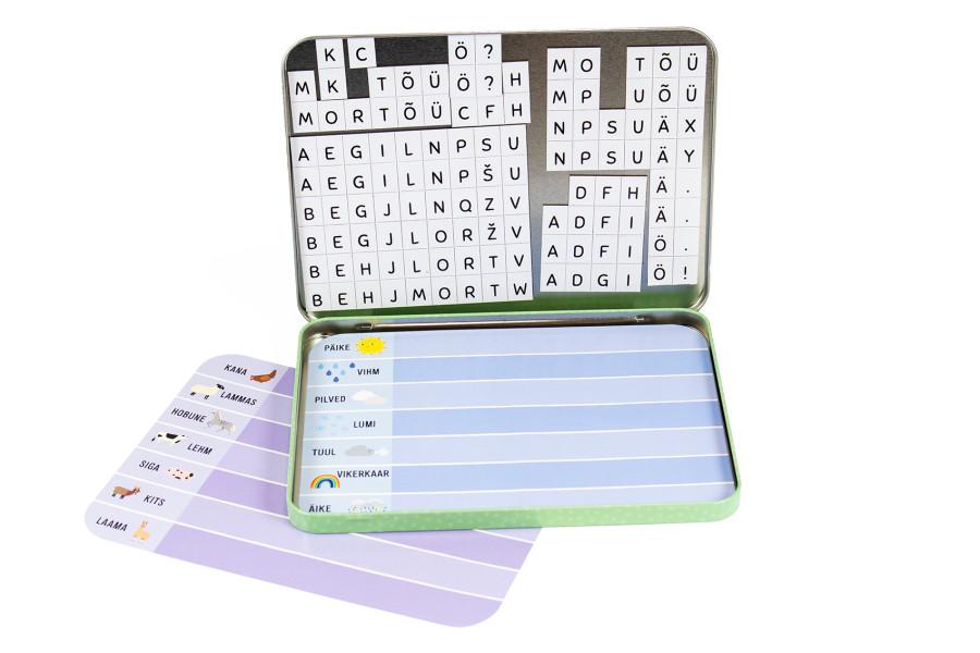Õhukeses plekk-karbis on 12 ülesannetekaarti ja 132 magnettähte. Kaartide peal saab magnettähtedest sõnu laduda. Tähti ladudes õpib laps sõnu kokku panema ja lugema. Kui etteantud sõnad on selged, saab ka ise uusi sõnu ja terveid lauseid moodustada. Õppimine on põnev!